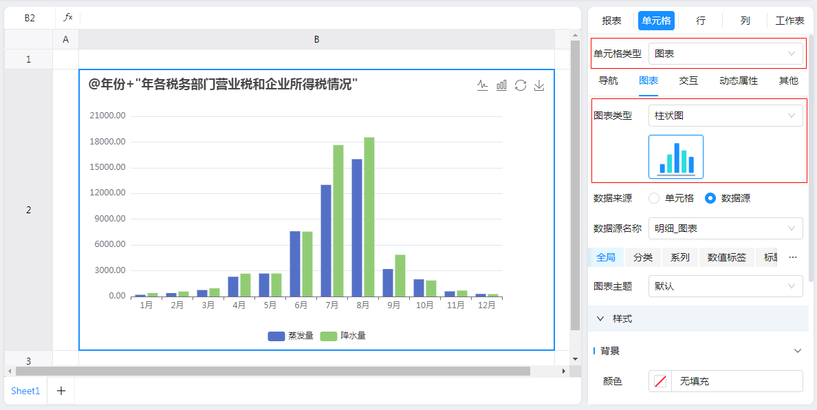 2)设置图表标题为“=@年份+”年各税务部门营业税和企业所得税情况””,如下图: