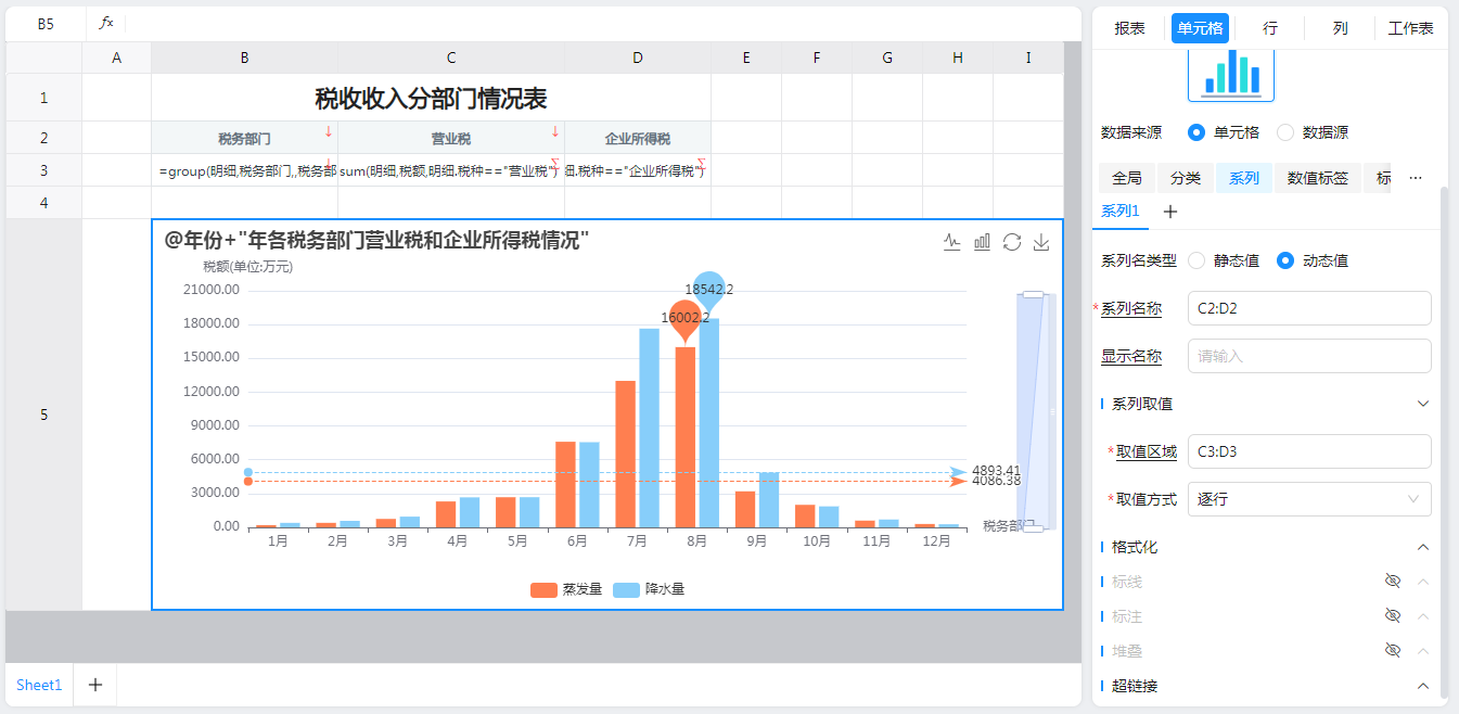 如果图表系列需要使用超链接,则需在单元格上先进行超链接配置,然后在每个系列上选择是否使用超链接、使用哪个超链接,支持动态展示超链接。